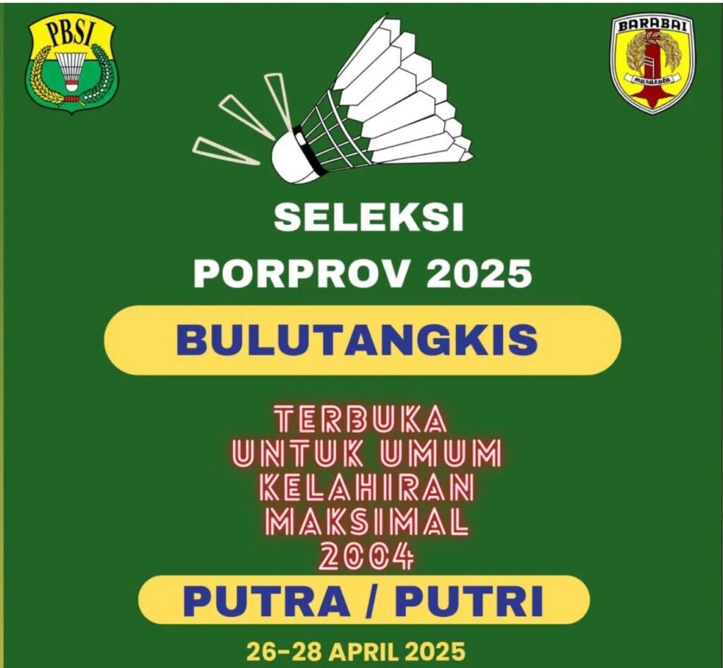 NusaHeadline.com, Hulu Sungai Tengah – Persatuan Bulutangkis Seluruh Indonesia (PBSI) Kabupaten Hulu Sungai Tengah (HST) akan menggelar seleksi terbuka untuk menjaring atlet putra dan putri yang akan memperkuat kontingen HST pada ajang Pekan Olahraga Provinsi (PORPROV) 2025. Kegiatan seleksi ini dijadwalkan berlangsung pada 26 hingga 28 April 2025 di GOR Bintara Jaya Barabai.