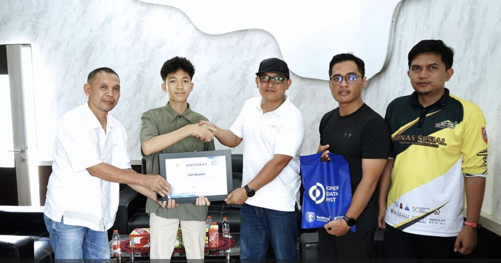Penghargaan diserahkan langsung oleh Kepala Dinas Kominfo HST, Darkuni, didampingi Tim Open Data HST, pada Jumat (2/5/2025) di ruang kerja Kepala Dinas. Dalam sambutannya, Darkuni menyampaikan apresiasi atas kontribusi Zaki yang dianggap luar biasa, terlebih datang dari seorang pelajar.